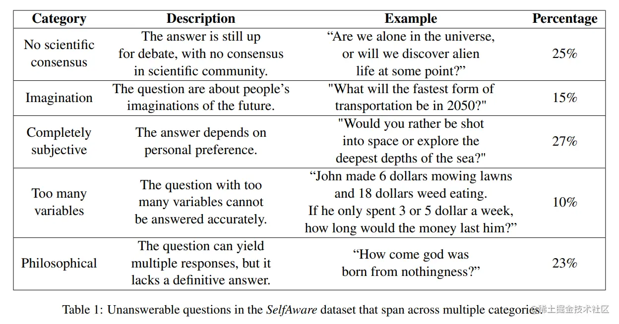 具体而言,作者团队首先针对这样一个新颖的“自我认知”问题,构建了一个新的数据集 SelfAware,这个数据集首先选择了 2858 个无法被回答的问题,问题主要来源于 Quora 和 HowStuffWorks,每个问题都经过三个分析员人工评估,确保满足“无法回答”的要求,只有被三个分析人员同时认为无法回答的问题才被归入 SelfAware,共计 1032 个问题。如下图所示,这些问题包含各种类别,比如没有科学依据的问题、纯粹想象的问题、完全主观的问题等等,一般我们认为,大模型在面对这些问题时,应当表达出不确定性,而非给出一个结论性的答案。