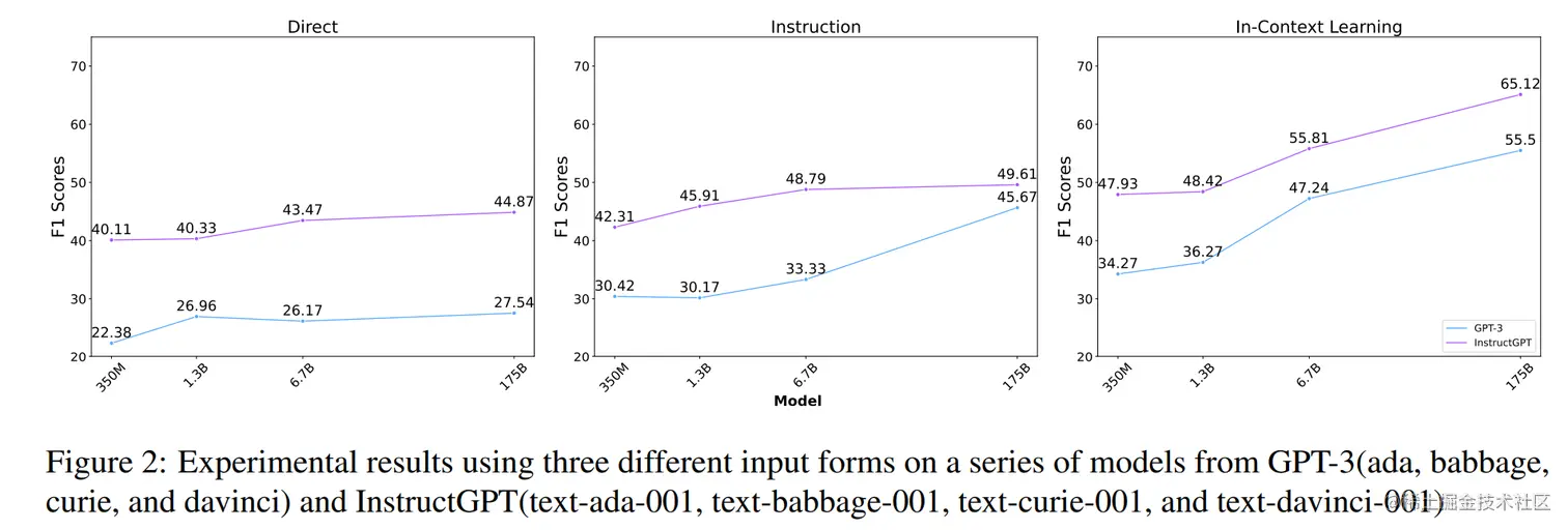 同时,对比不同种的输入方式,也可以看到 Prompt 与上下文学习都可以显著提升大模型的自知能力,尤其是在 davinci 系列模型中,使用上下文学习的形式相比使用直接学习可以提升 27.96% 的性能。而在模型可回答的问题中,随着模型参数的增加,QA 任务的准确率得到飞速提升: