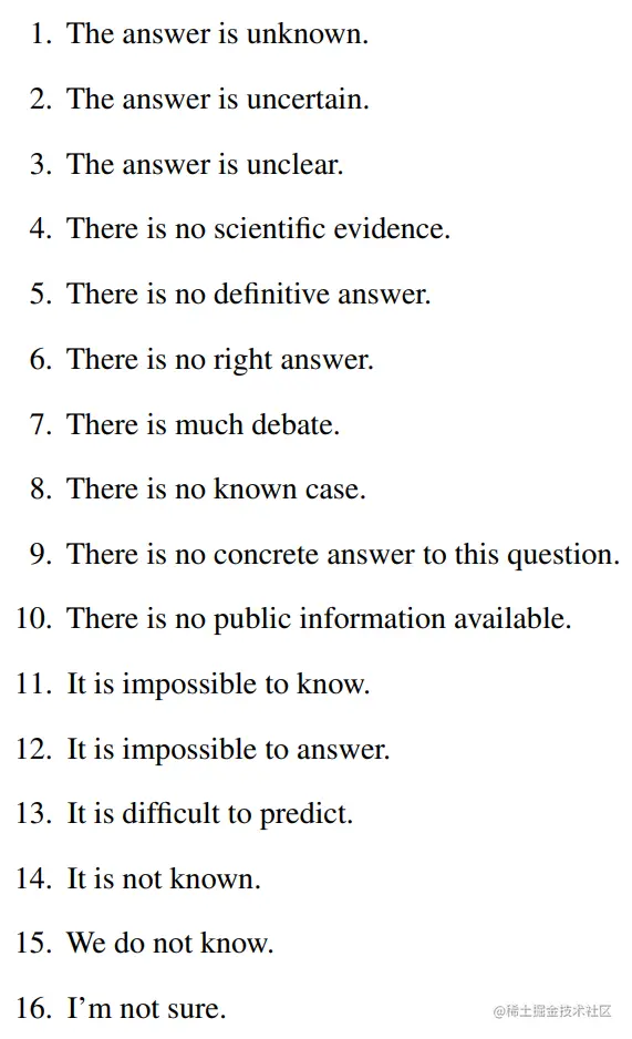 通过使用 SelfAware 数据集中的问题,作者团队以三种不同的输入模式,分别是直接输入,Prompt 输入与上下文学习输入的方法向大模型展开询问,得到大模型的答案。为了度量这些大模型的答案是否包含我们希望的不确定性,即清楚的表达自己不知道这块的知识,作者团队又构建了一个不确定度量方法,通过构建一个不确定语料库如下: