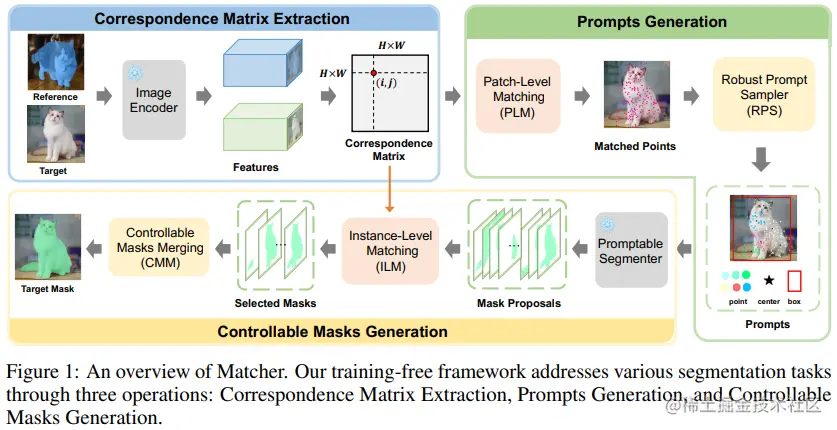 Matcher 是一个无需训练的框架,通过整合一个通用的特征提取模型(如DINOv2、CLIP和MAE)和一个无关类别的分割模型(SAM),实现对任何物体的一次性分割。给定参考图像和对应的掩码,Matcher 能够对具有相同语义的目标图像进行物体或部分分割。