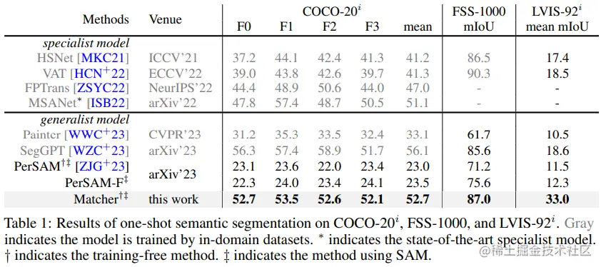 在实验部分,作者对 Matcher 进行了多项实验来评估其在不同任务上的性能。首先,在一次性语义分割任务上,文中评估了 Matcher 在COCO20i、FSS-1000和LVIS-92i数据集上的表现。实验结果表明,Matcher在这些任务上取得了竞争性的性能,并超过了专门模型和通用模型的表现。