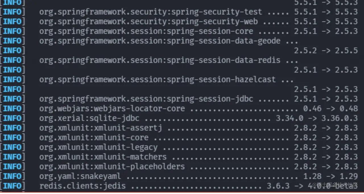 然后可以把依赖项升级到输出的对应版本,大部分包升级不会出问题,如果有问题,建议去出问题的依赖官方仓库寻找解决方案。这个命令是直接查询maven远程仓库,如果依赖项多的话会运行比较长的时间