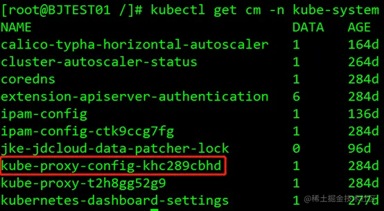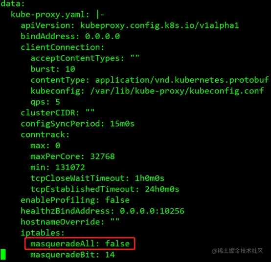 我们决定测试开启下--masquerade-all这个参数。kube-proxy在集群中的每个节点上以pod形式运行,而kube-proxy的参数配置都以configmap形式挂载到pod上。我们执行kubectl get cm -n kube-system查看kube-proxy的configmap,如图所示: