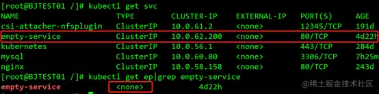 攻城狮推断,既然service对后端的pod起到DNAT和负载均衡的作用,那么当客户端ping service地址时,ICMP包应该是由service直接应答客户端的,即service代替后端pod答复客户端的ping包。为了验证我们的推断是否正确,我们在集群中新建一个没有关联任何后端的空服务,如图所示:
