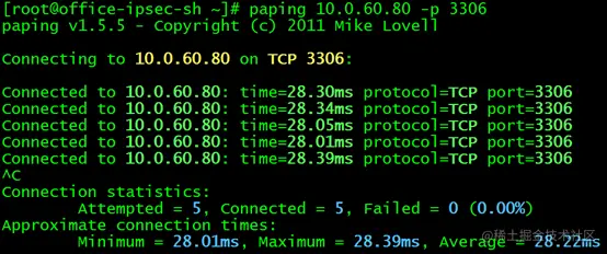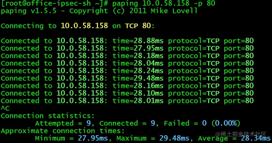 接下来激动人心的时刻到来了,我们将访问service的路由指向node B,然后在上海客户端上执行paping 10.0.58.158 -p 80观察测试结果(期待地搓手手):