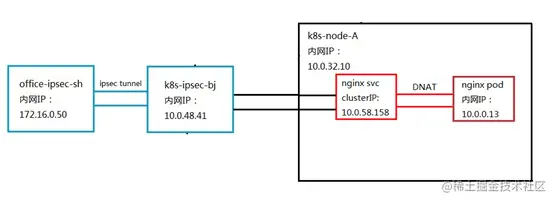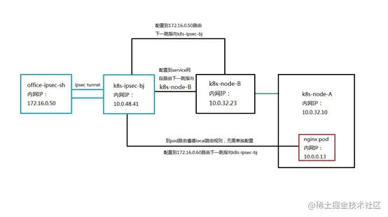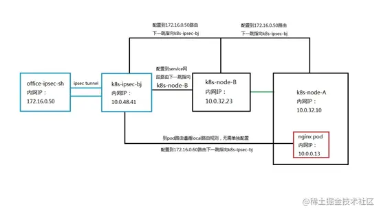 确定了方案,我们需要在测试环境实施方案验证可行性。由于我们没有云下环境,因此选取和K8S集群不同地域的云主机代替客户的办公网端点设备。在华东上海地域创建云主机office-ipsec-sh模拟客户办公网客户端,在华北北京地域的K8S集群K8S-BJTEST01所在VPC的NAT/LB子网创建一个有公网IP的云主机K8S-ipsec-bj,模拟客户场景下的ipsec云上端点,与华东上海云主机office-ipsec-sh建立ipsec隧道。设置NAT/LB子网的路由表,添加到service网段的路由下一跳指向K8S集群节点k8s-node-vmlppp-bs9jq8pua,以下简称node A。由于pod子网和NAT/LB子网同属于一个VPC,所以无需配置到pod网段的路由,访问pod时会直接匹配local路由,转发至对应的弹性网卡上。为了实现数据包的返回,在node子网和pod子网分别配置到上海云主机office-ipsec-sh的路由,下一跳指向K8S-ipsec-bj。完整架构如下图所示: