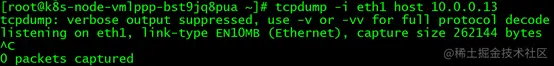 我们移步node A进行抓包。在node B上的抓包我们可以获悉node A上应该只有客户端IP和pod IP的交互,因此我们就从这两个维度抓包。根据之前抓包的分析结果,数据包进入节点内之后,应该通过虚拟设备cni34f0b149874与pod交互。而node B节点访问pod应该从node A的弹性网卡eth1进入节点,而不是eth0,为了验证,首先执行命令tcpdump -i eth0 host 172.16.0.50和tcpdump -i eth0 host 10.0.0.13,没有抓到任何数据包。