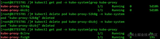 要想使配置生效,需要逐一删除当前的kube-proxy pod,daemonset会自动重建pod,重建的pod会挂载修改过的configmap,masqueradeALL功能也就开启了。如图所示: