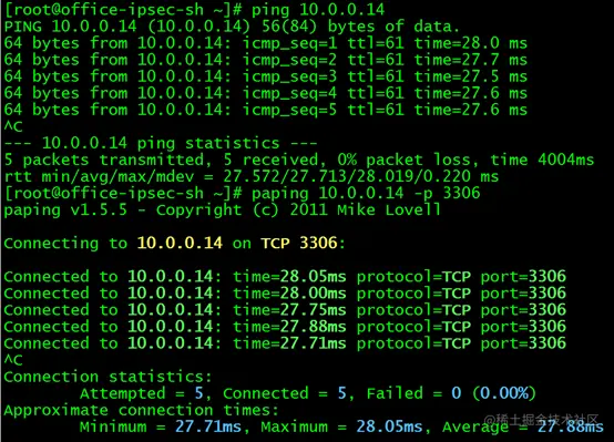 该服务后端的pod是10.0.0.13,部署nginx默认页面,并监听80端口。在上海云主机上测试ping service的IP 10.0.58.158,可以ping通,同时使用paping工具ping服务的80端口,也可以ping通!