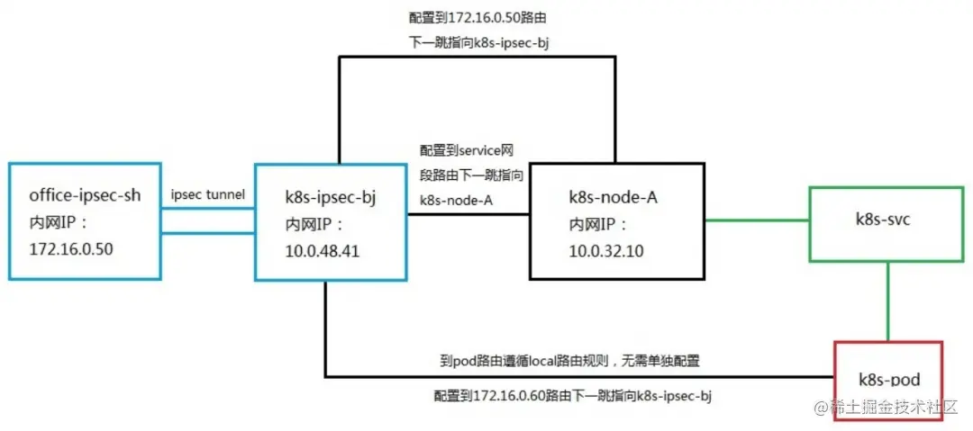 我们来看自建VPN方式,自建VPN在客户办公网和云上网络各有一个有公网IP的端点设备,两个设备之间建立加密通讯隧道,实际底层还是基于公网通讯。如果使用该方案,云上的端点我们可以选择和集群节点在同一VPC的不同子网下的有公网IP的云主机。办公网侧对service和pod的访问数据包通过VPN隧道发送至云主机后,可以通过配置云主机所在子网路由,将数据包路由至某个集群节点,然后在集群节点所在子网配置到客户端的路由下一跳指向端点云主机,同时需要在pod子网也做相同的路由配置。至于VPN的实现方式,通过和客户沟通,我们选取ipsec隧道方式。