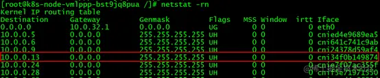 那么pod是通过哪个网络接口进行收发包的呢?执行命令netstat -rn查看node A上的网络路由,我们有了如下发现: