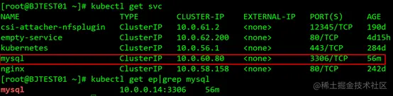 正当攻城狮心里美滋滋,以为一切都大功告成的时候,测试访问另一个service的结果犹如一盆冷水泼来。我们接着选取了mysql这个service,测试访问3306端口。该serivce的clusterIP是10.0.60.80,后端pod的IP是10.0.0.14