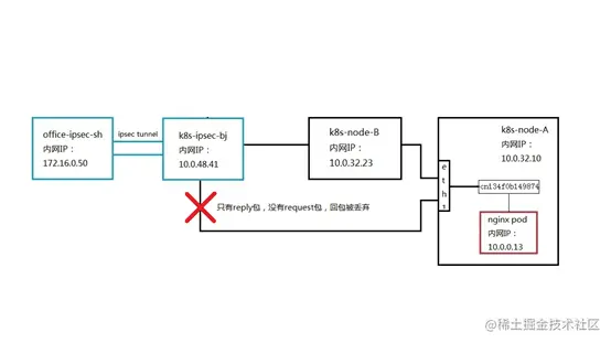 由于pod给客户端回包是从node A的eth1网卡发出的,所以虽然按照正常DNAT规则,数据包应该发回给node B上的service端口,但是受eth1子网路由表影响,数据包直接被“劫持”到了k8s-ipsec-bj这个主机上。而数据包到了这个主机上之后,由于没有经过service的转换,回包的源地址是pod地址10.0.0.13,目的地址是172.16.0.50,这个数据包回复的是源地址172.16.0.50,目的地址10.0.58.158这个数据包。相当于请求包的目的地址和回复包的源地址不一致,对于k8s-ipsec-bj来说,只看到了10.0.0.13给172.16.0.50的reply包,但是没有收到过172.16.0.50给10.0.0.13的request包,云平台虚拟网络的机制是遇到只有reply包,没有request包的情况会将request包丢弃,避免利用地址欺骗发起网络攻击。所以客户端不会收到10.0.0.13的回包,也就无法完成对service的请求。在这个场景下,数据包的通路如下图所示: