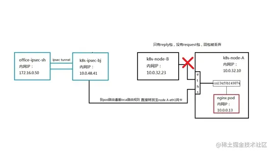 如图所示,可以看到客户端对Pod的请求到达k8s-ipsec-bj后,由于是同一vpc内的地址访问,所以遵循local路由规则直接转发到node A eth1网卡,而pod给客户端回包时,受eth1网卡路由控制,发送到了node B上。node B之前没有收到过客户端对pod的request包,同样会遇到只有reply包没有request包的问题,所以回包被丢弃,客户端无法请求pod。
