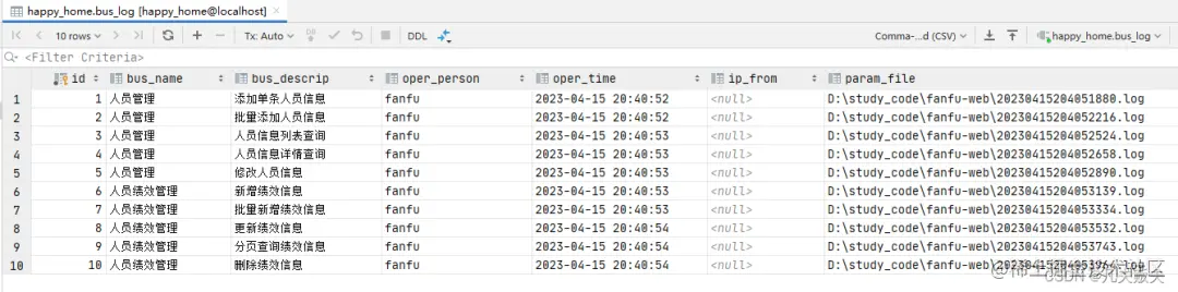 业务操作日志记录中包含了用户操作的功能名称、功能描述、操作人、操作时间和操作的参数报文,参数报文之所以选择存储在文件中,是因为正常情况下,是不需要知道具体的参数报文,只有在回滚操作的时候才会用到,可以根据上一次的参数报文逆向操作。