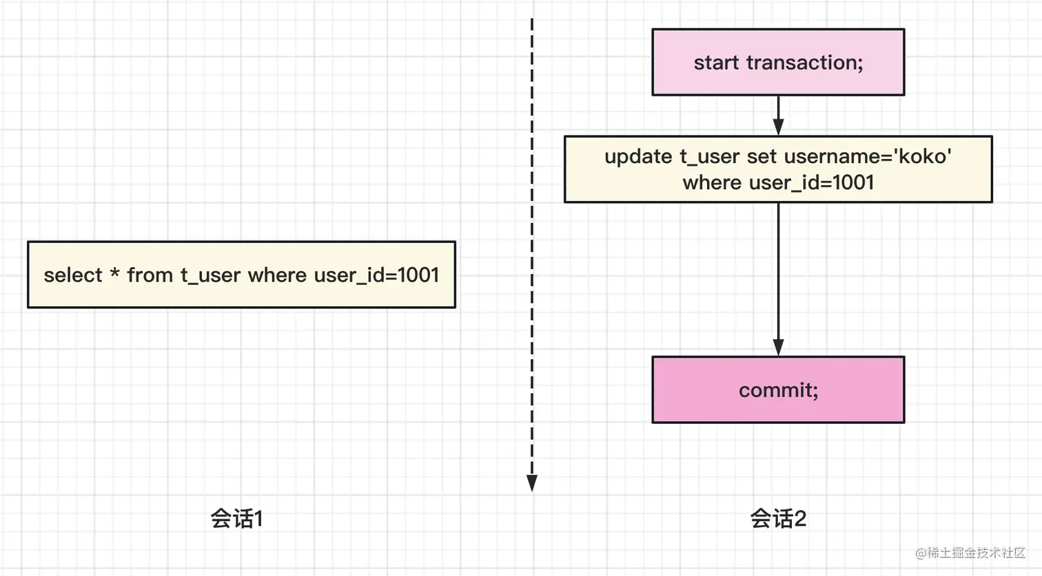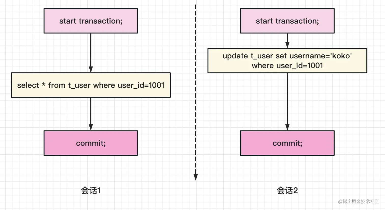 但是假设我们的会话1是带有事务的话,那么逻辑就会稍微有些变化,见下图: