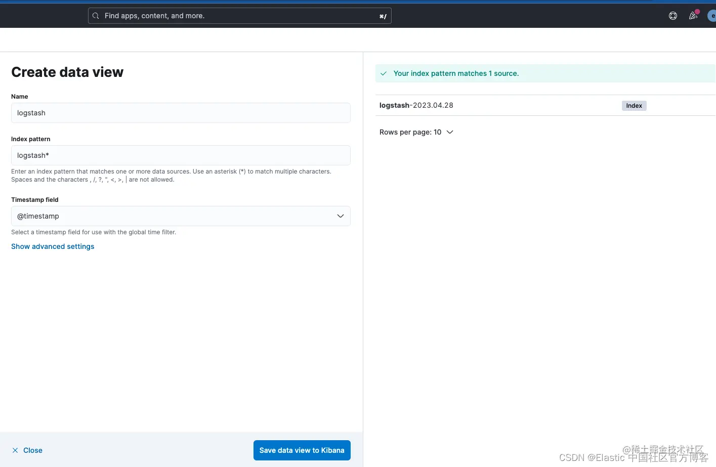 请注意,Logstash 输出索引名称是“logstash-%{+YYYY.MM.dd}”。 要查看数据,你需要为 logstash-* 模式创建数据视图,如下所示。