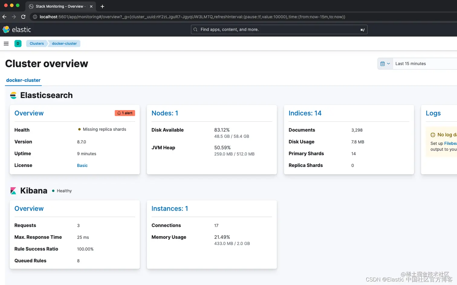 现在,随着 Filebeat 和 Logstash 的启动和运行,如果你导航回 Cluster Monitoring,你将看到 Logstash 被监控,以及 Elasticsearch 日志的一些指标和链接。