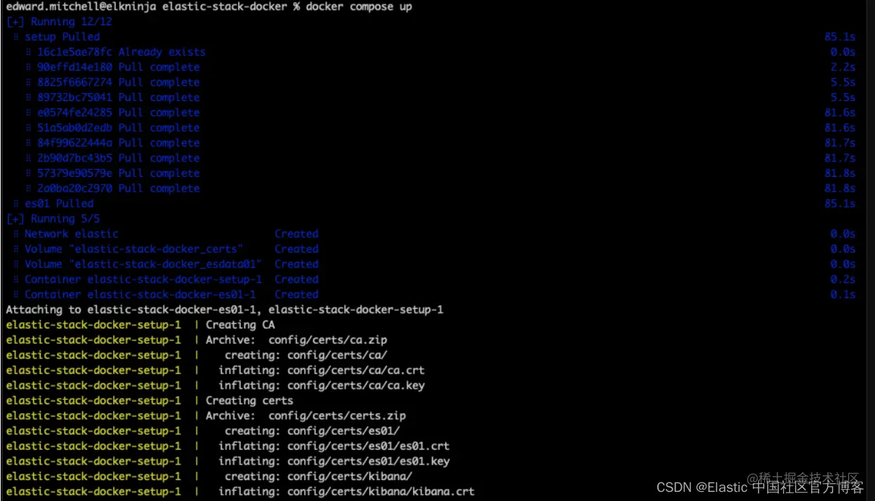 我们在这里使用 STACK_VERSION 环境变量,以便将其传递给 docker-compose.yml 文件中的每个服务(容器)。 使用 Docker 时,选择硬编码版本号而不是使用 :latest 标签之类的东西是保持对环境的积极控制的好方法。 对于 Elastic Stack 的组件,不支持 :latest 标签,我们需要版本号来拉取镜像。