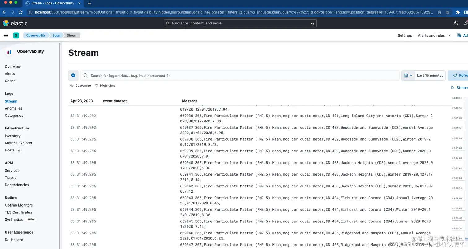 首先,我们设置绑定挂载以将文件夹 filebeat_ingest_data 映射到容器中。 如果你的主机上不存在此文件夹,它将在容器启动时创建。 如果你想在 Elastic Observability 中为你的自定义日志测试日志流查看器,你可以轻松地将任何具有 .log 扩展名的文件放入 /filebeat_ingest_data/,日志将被读入默认的 Filebeat 数据流。