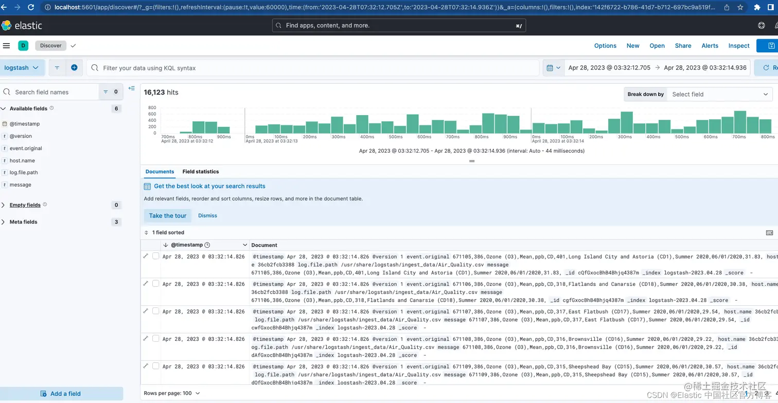 Logstash 配置与 Filebeat 配置非常相似。 我们再次使用绑定挂载并将名为 /logstash_ingest_data/ 的文件夹从主机映射到 Logstash 容器。 在这里,你可以通过修改 logstash.yml 文件来测试许多输入插件和过滤器插件中的一些。 然后将你的数据放入 /logstash_ingest_data/ 文件夹。 修改 logstash.yml 文件后,你可能需要重新启动 Logstash 容器。