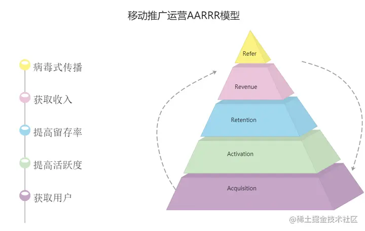 AARRR漏斗模型,又称海盗模型,是一套从获客到客户维护的整体模型,它贯穿着用户生命周期的始终,通过学习这个模型,能更好的判断用户处于什么阶段,采用什么策略。
