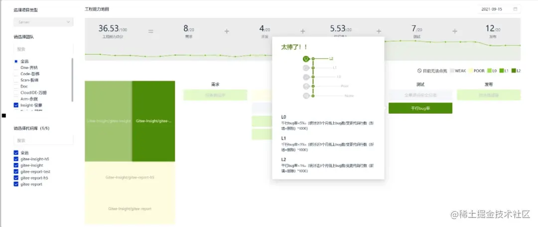 Gitee Insight 提供的度量评价系统不仅仅包含度量数据,更是研发最佳工程实践、配套全流程工具、进阶指南在内的工程能力提升完整解决方案,以助力业务线进行质量和效率提升。