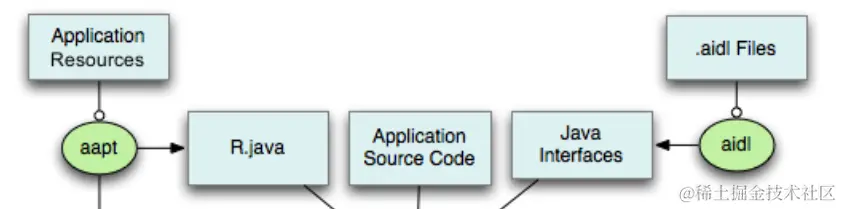 我们从上往下看,写代码期间会自动调用aapt和aidl工具。
