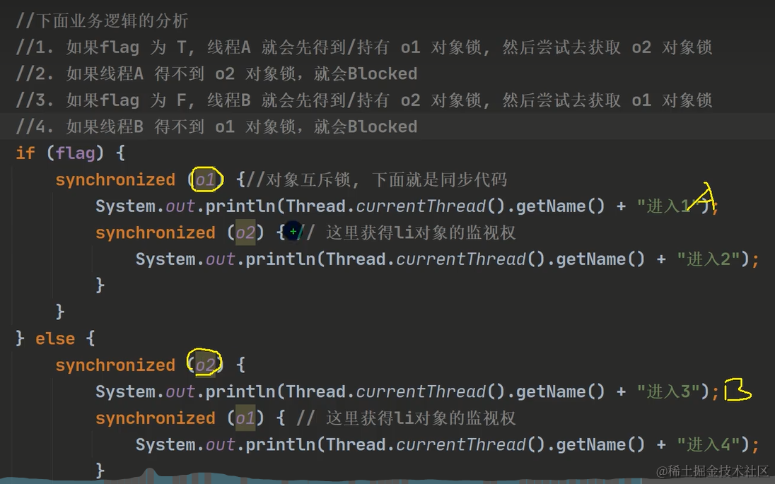 线程之间都占用了对象的锁资源,需要互相返回值才肯相让,才导致了死锁。