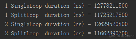 System.out.println(i + " SplitLoop duration (ns) = " + runCaseTwo());