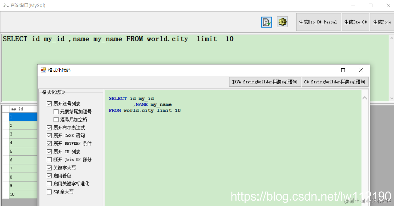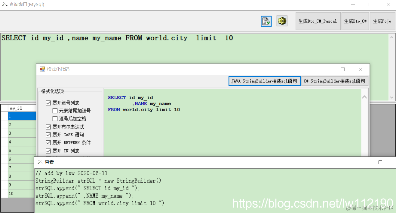 1、自定义查询、生成pojo、SQL格式化、StringBuilder拼装SQL。