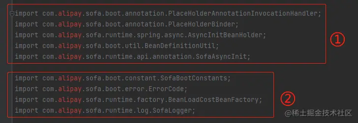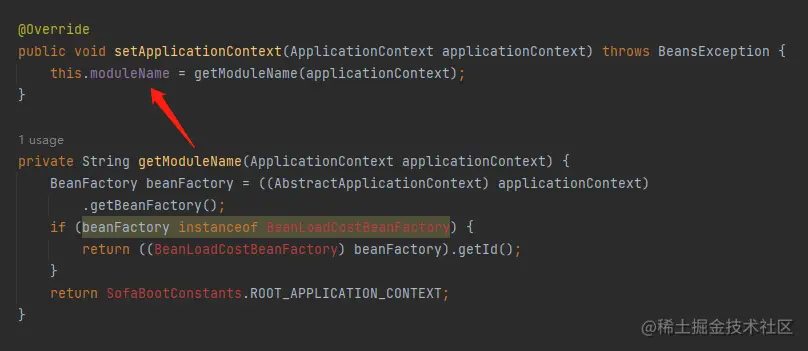 标号为 ② 的部分,比如 BeanLoadCostBeanFactory 和 SofaBootConstants,他们的目的是为了获取一个 moduleName 变量: