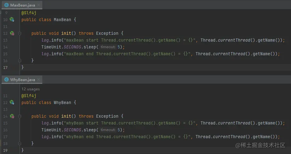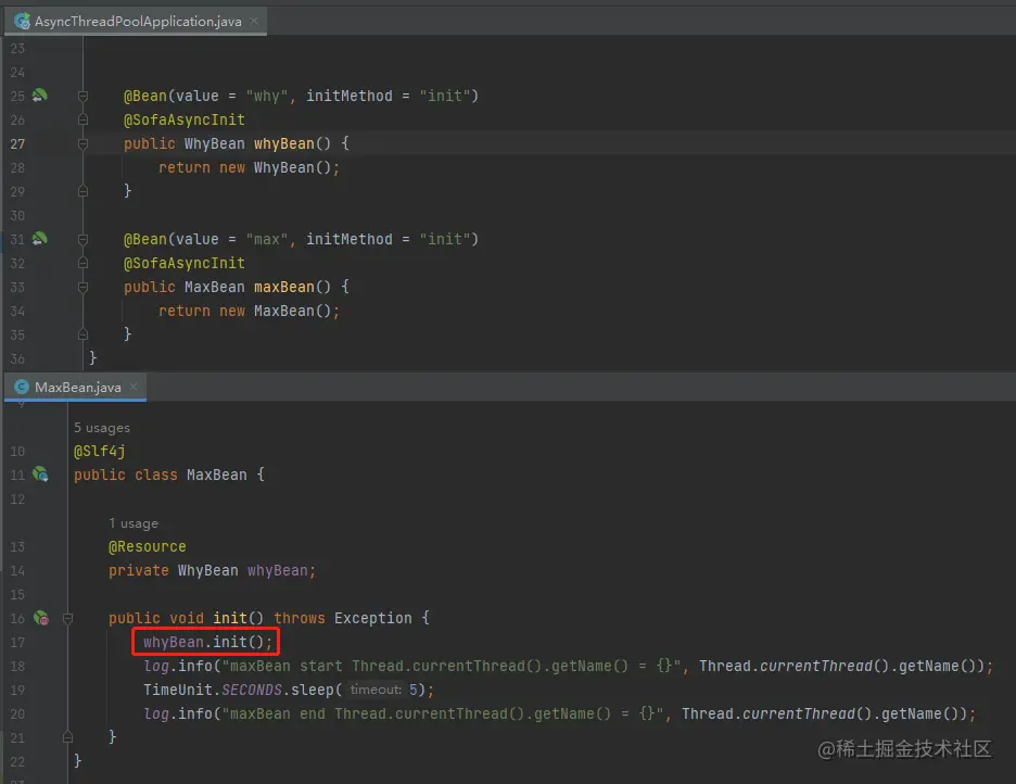 - whyBean 和 maxBean 的 init 方法是由两个不同的线程并行执行的。