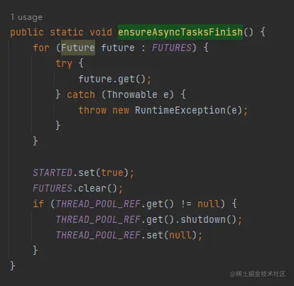 在这个方法里面,调用了 future 的 get 方法进行阻塞等待。当所有的 future 执行完成之后,会关闭线程池。