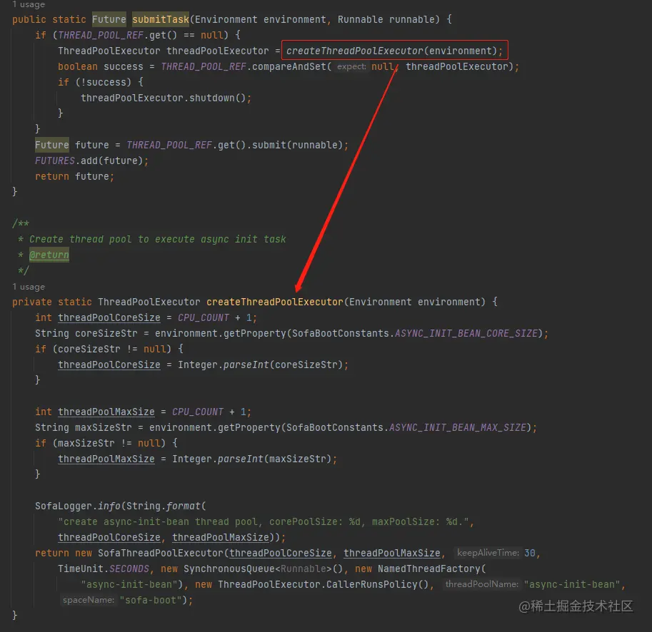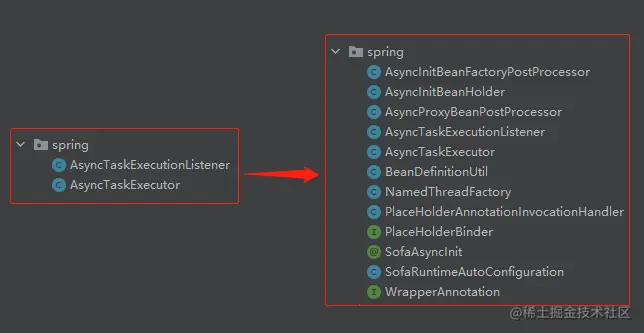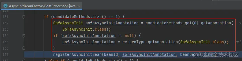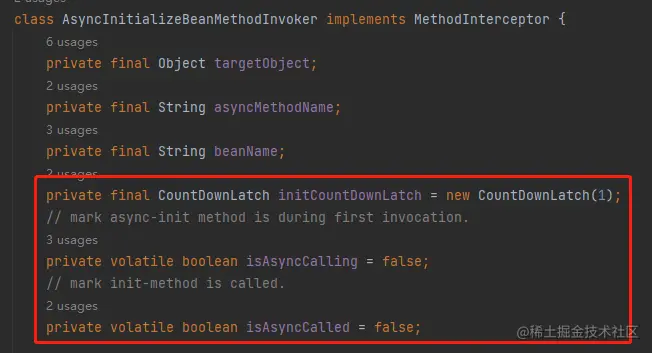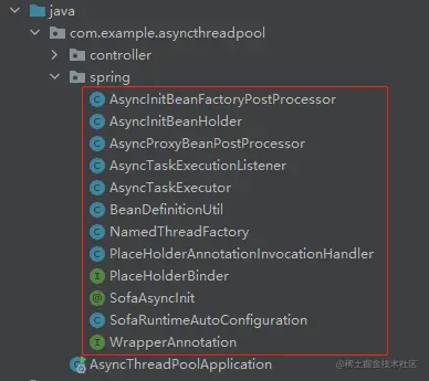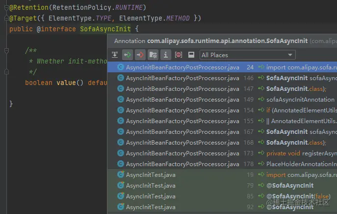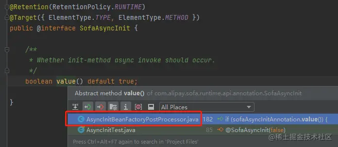 我这边是直接把 SOFABoot 源码搞下来了,先把源码里面的 @SofaAsyncInit 注解粘到项目里面来,然后从 @SofaAsyncInit 注解入手,发现除了测试类只有一个 AsyncInitBeanFactoryPostProcessor 类在对其进行使用: