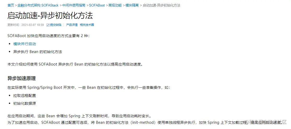 仅从“启动加速-异步初始化方法”这个标题上来看,Spring 官方不支持的东西 SOFABoot 支持了。所以这玩意让我眼前一亮,我倒要看看你是怎么搞得。