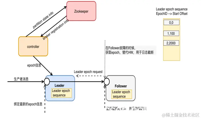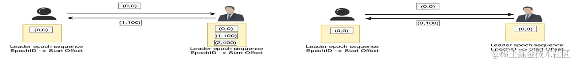 如果需要需要从本地的Leader Epoch Sequence加载数据,将数据存储在内存中,给相应的分区的Leader发送epoch 请求,该请求包含最新的EpochID,StartOffset信息.Leader接收到信息以后返回该EpochID所对应的LastOffset信息。该信 息可能是最新EpochID的StartOffset或者是当前EpochID的Log End Offset信息.