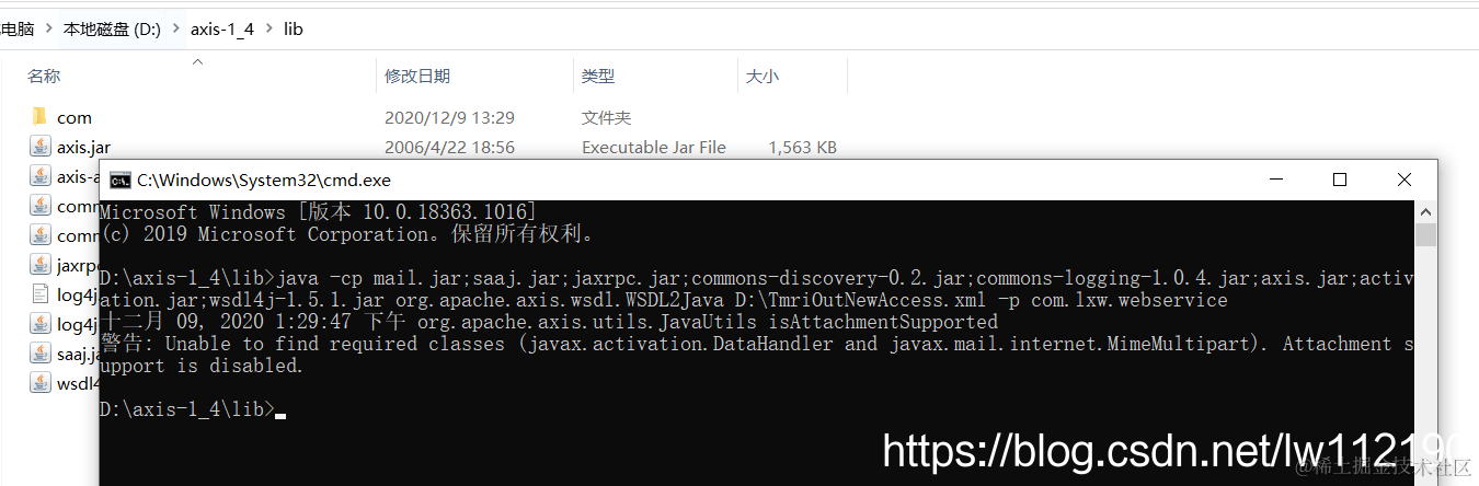 java -cp mail.jar;saaj.jar;jaxrpc.jar;commons-discovery-0.2.jar;commons-logging-1.0.4.jar;axis.jar;activation.jar;wsdl4j-1.5.1.jar org.apache.axis.wsdl.WSDL2Java D:\TmriOutNewAccess.xml -p com.lxw.webservice