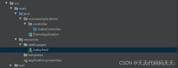 在原有的项目resouces目录下创建static包,并在static下创建pages,然后在pages包下index.html.