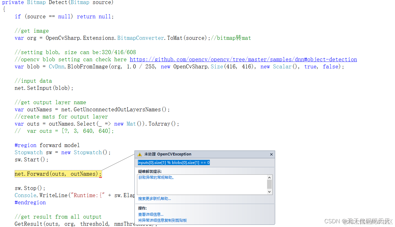 在 OpenCvSharp.NativeMethods.dnn_Net_forward3(IntPtr net, IntPtr[] outputBlobs, Int32 outputBlobsLength, String[] outBlobNames, Int32 outBlobNamesLength)