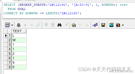 Oracle 字符串拆分成一个一个字符 天天代码码天天 2023-06-05 51 阅读1分钟 SELECT (REGEXP_SUBSTR('LW112190', '[A-Z0-9]', 1, ROWNUM)) test FROM DUAL CONNECT BY ROWNUM <= LENGTH('LW112190')
