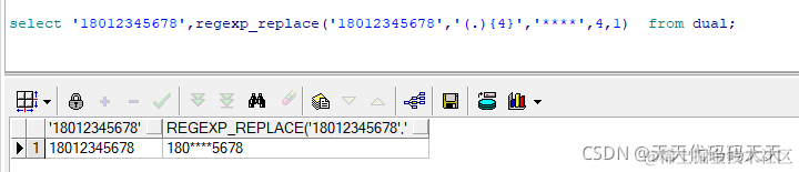 Oracle regexp_replace 手机号脱敏 天天代码码天天 2023-06-05 99 阅读1分钟 select '18012345678',regexp_replace('18012345678','(.){4}','****',4,1) from dual;