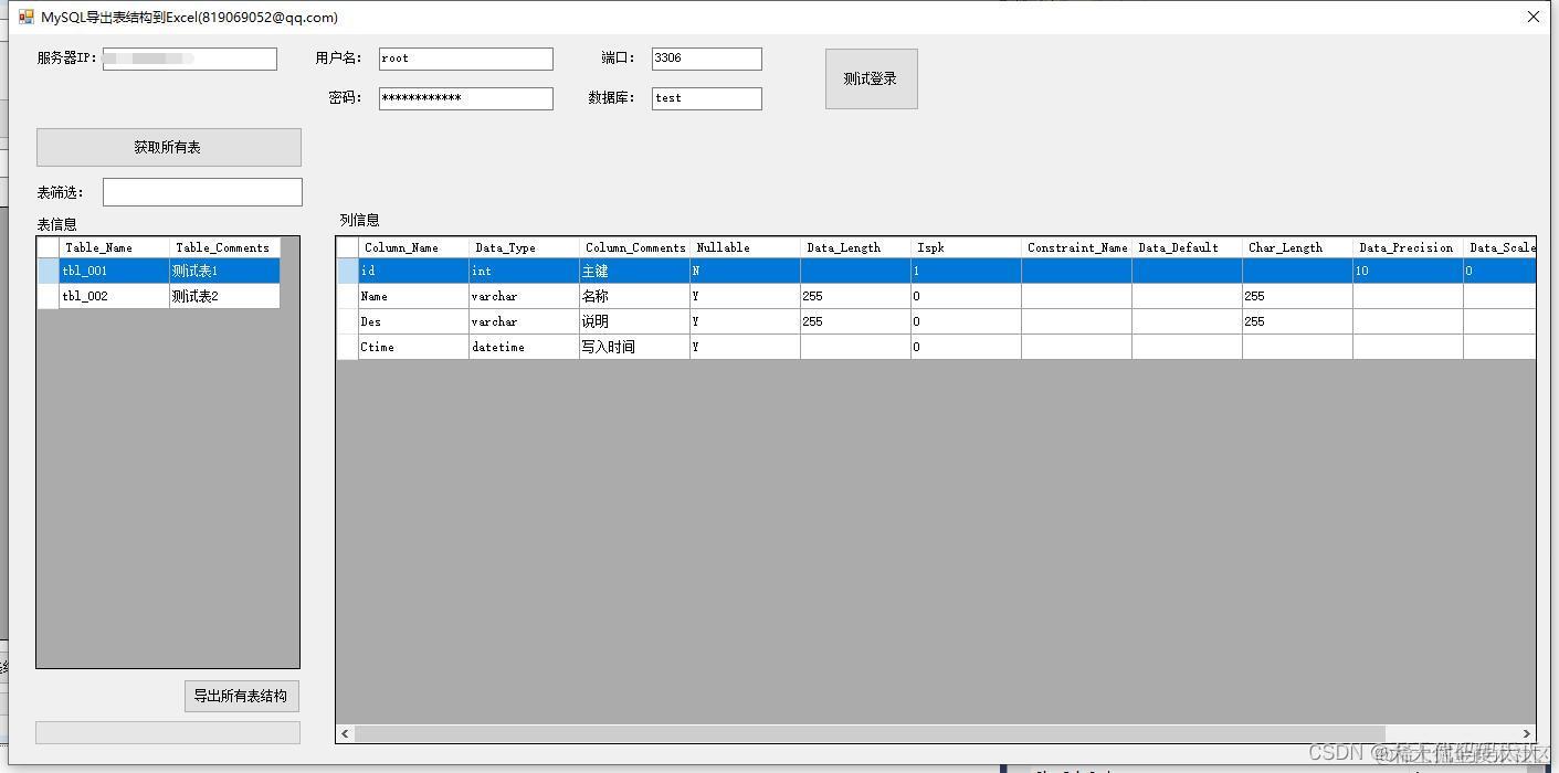 C# MySQL导出表结构到Excel 天天代码码天天 2023-06-05 98 阅读1分钟 软件如图,输入基础信息,点击“测试登录” 连接MySQL需要安装驱动,如下图 连接成功如下图 登录成功后,自动获取所有表信息 双击表名称,右侧查看表结构信息 导出表结构效果如下图 表目录 表结构 下载地址