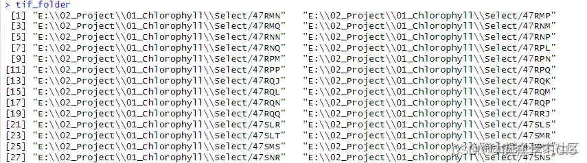 接下来,我们通过list.files()函数,将包含有各个条带号的小文件夹的大文件夹(也就是本文开头第一张图所示的文件夹)加以遍历,将每一个小文件夹的路径存入tif_folder。执行上述前3行代码后,得到的tif_folder结果如下图所示。