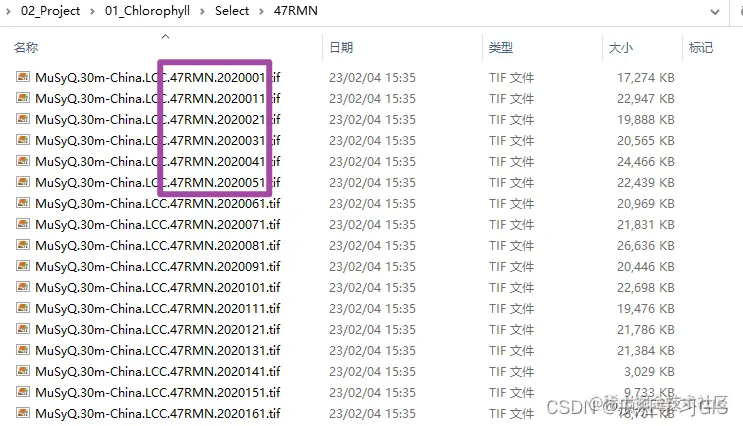 其中,上图中的每一个文件夹的命名都是以遥感影像的分幅条带号为依据的。例如,打开第一个名为47RMN的文件夹,其中均为条带号为47RMN(即同一空间范围)、不同成像时间的遥感影像,如下图所示;其中,紫色框内的遥感影像文件名即可看出,这些图像是同一条带号、不同时间的遥感影像数据。