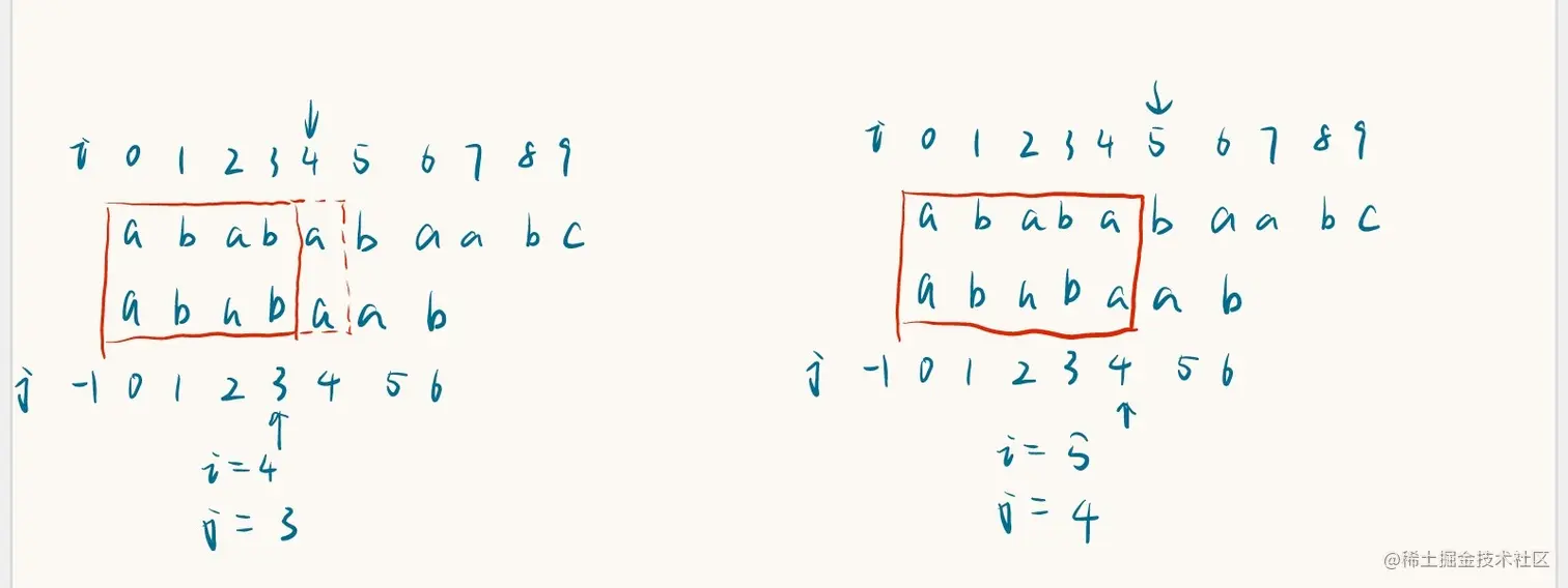 // 匹配成功时,文本串结束位置减去模式串结束位置即为起始位置(可以通过上图得知)
