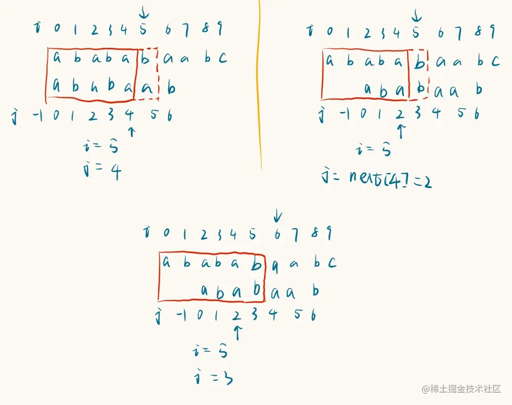 // 需要让 j 回退到一定位置,再让 i 加 1 继续进行比较
