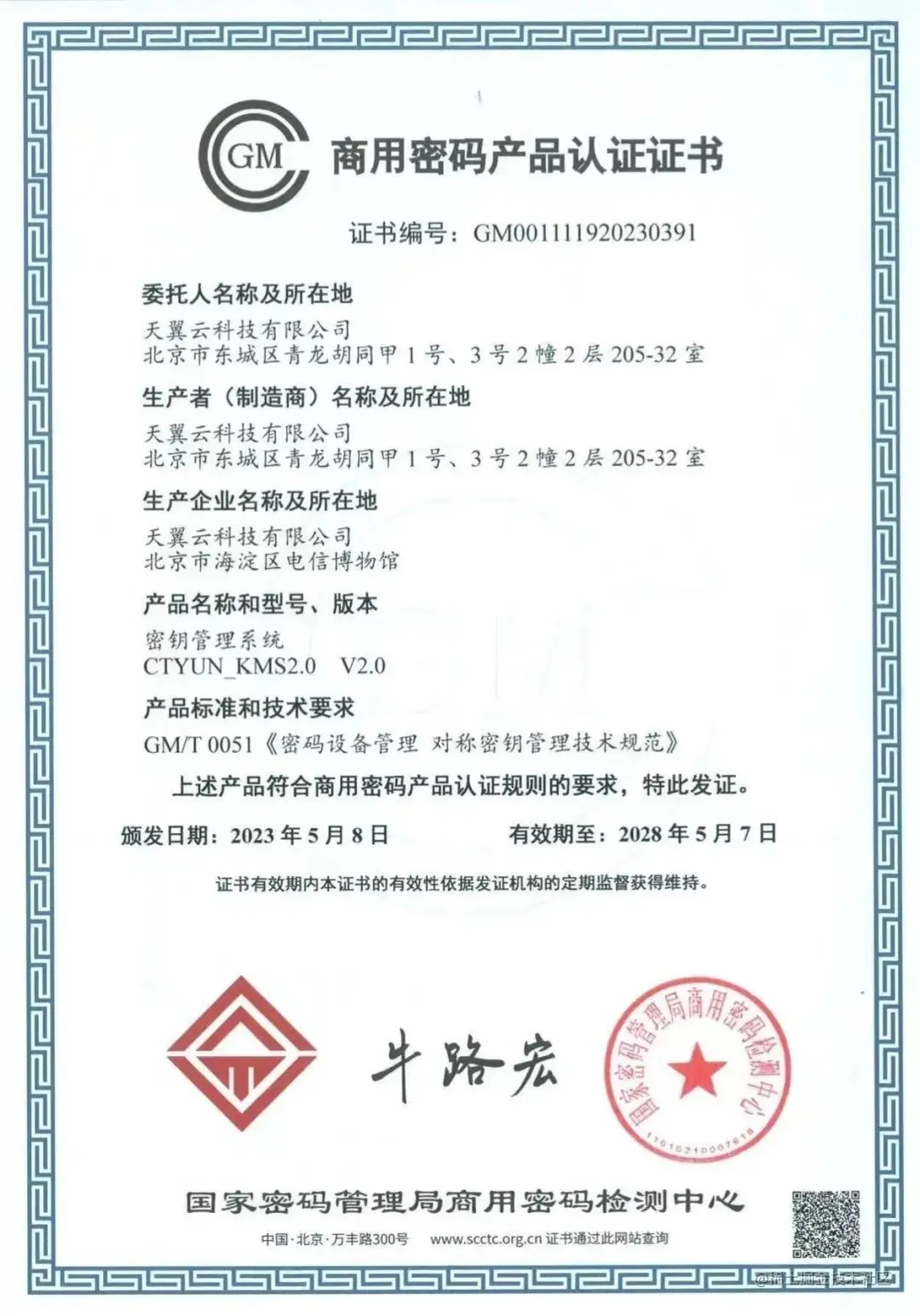 近日,天翼云自研密钥管理系统(KMS)通过国家密码管理局安全性审查,符合GM/T 0051《密码设备管理 对称密钥管理技术规范》要求,获得由国家密码管理局商用密码检测中心颁发的《商用密码产品认证证书》。