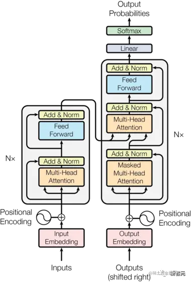Decoder Transformer相对于Encoder Transformer多了一个Encoder-Decoder Attention层,用来接收来自于Encoder的输出作为参数。最终只要按照下图的方式堆叠,就可以完成Transformer Seq2Seq的结构搭建。
