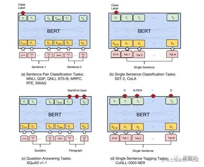 Fine-Tuning阶段BERT的Fine-Tuning阶段和GPT没有太大区别。因为采用了双向的Transformer所以放弃了GPT在Fine-Tuning阶段使用的辅助训练目标,也就是语言模型。此外就是将分类预测用的输出向量从GPT的最后一个词的输出位置改为了句子开头的位置了。不同的任务Fine-Tuning的示意图如下: